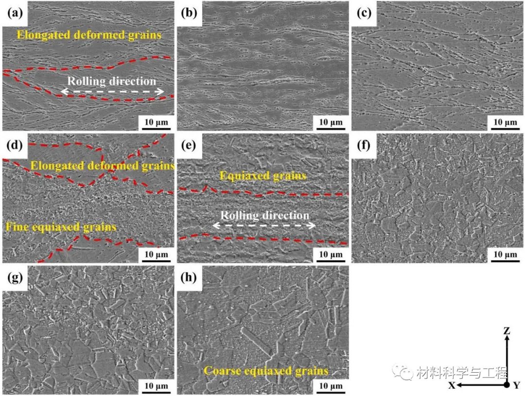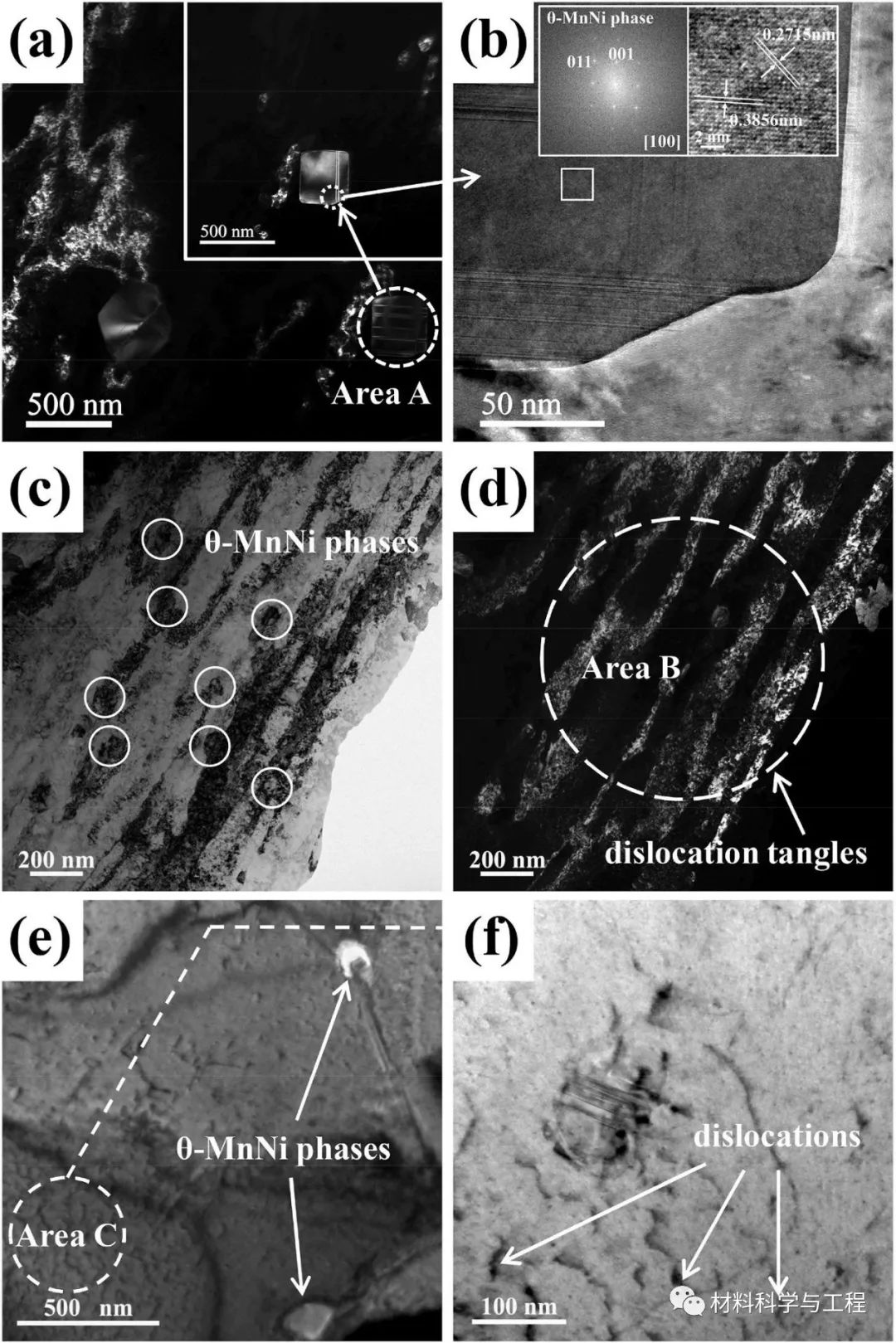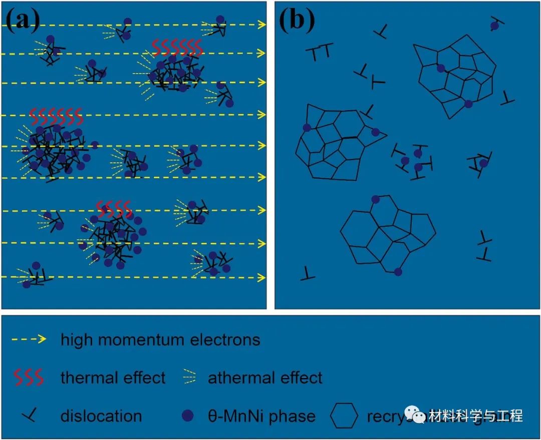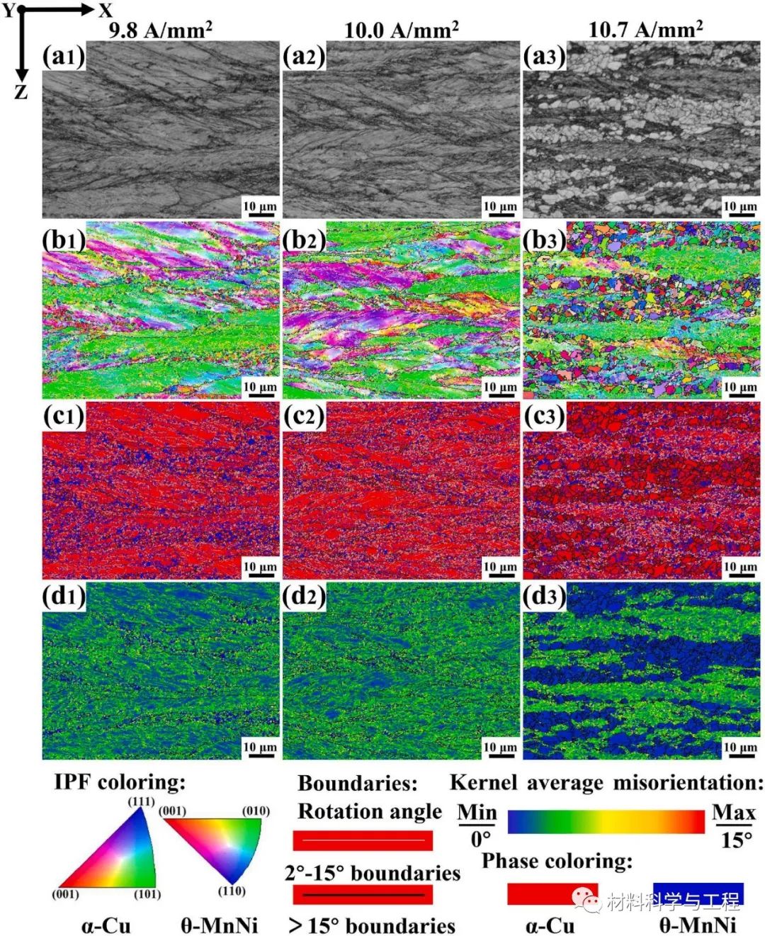 研究发现,形变时效Cu-20Ni-20Mn合金微观组织主要由严重拉长的变形晶粒组成,经过9.8A/mm2和10.0A/mm2电流密度的EPT后,微观结构未发现明显的新晶粒。随着电流密度的增加,组织中等轴晶比例增加,当电流密度达到11.6A/mm2时出现完整的等轴晶粒,电流密度继续增加,等轴晶粒逐渐粗化,与传统热处理相比,EPT加速了形变时效Cu-20Ni-20Mn合金的微观组织演化。EPT的热效应和非热效应明显引发了回复和再结晶,一方面合金在严重塑性变形过程中产生了高密度位错缠结,由于位错缠结的阻力大于Cu基体,电子通过位错缠结消耗的电能高于Cu基体消耗的电能。这部分电能被转化为焦耳热来加热位错缠结,焦耳热效应导致合金中发生了位错湮灭和形成亚晶粒,在EPT过程中,位错密度降低,亚晶界通过亚晶粒的合并或迁移转变为大角度晶界,形成了再结晶的形核位点;另一方面,合金内大量的高动量电子形成了电子风,这在一定程度上对促进合金的回复和再结晶过程有关键作用。