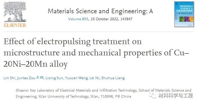 Cu-20Ni-20Mn合金由于其良好的物理、机械性能和耐腐蚀,广泛应用于航空航天和采矿领域。然而,铸态Cu-20Ni-20Mn合金的微观结构为粗大树枝晶,这极大地影响了合金的综合性能。此外,Cu-20Ni-20Mn合金晶界反应的活化能为晶内反应的60%,时效过程中θ-MnNi相的不连续析出较为显著。因此,虽然合金在时效后强度显著提高,但其延展性较差,实际应用时容易发生脆性断裂。现有研究证实,高温时效(>673 K)可以抑制θ-MnNi相的不连续析出,还有研究表明变形可以抑制不连续析出,促进合金中θ-MnNi相的均匀分布。研究人员近年来对Cu-20Ni-20Mn合金经过高温时效处理后的变形力学性能进行了研究,发现采用变形和高温时效处理相结合,很难同时提高合金的抗拉强度和伸长率。电脉冲处理(EPT)是一种能够同时提高强度和延展性的有效方法,但是EPT用于Cu-20Ni-20Mn合金的研究较少。