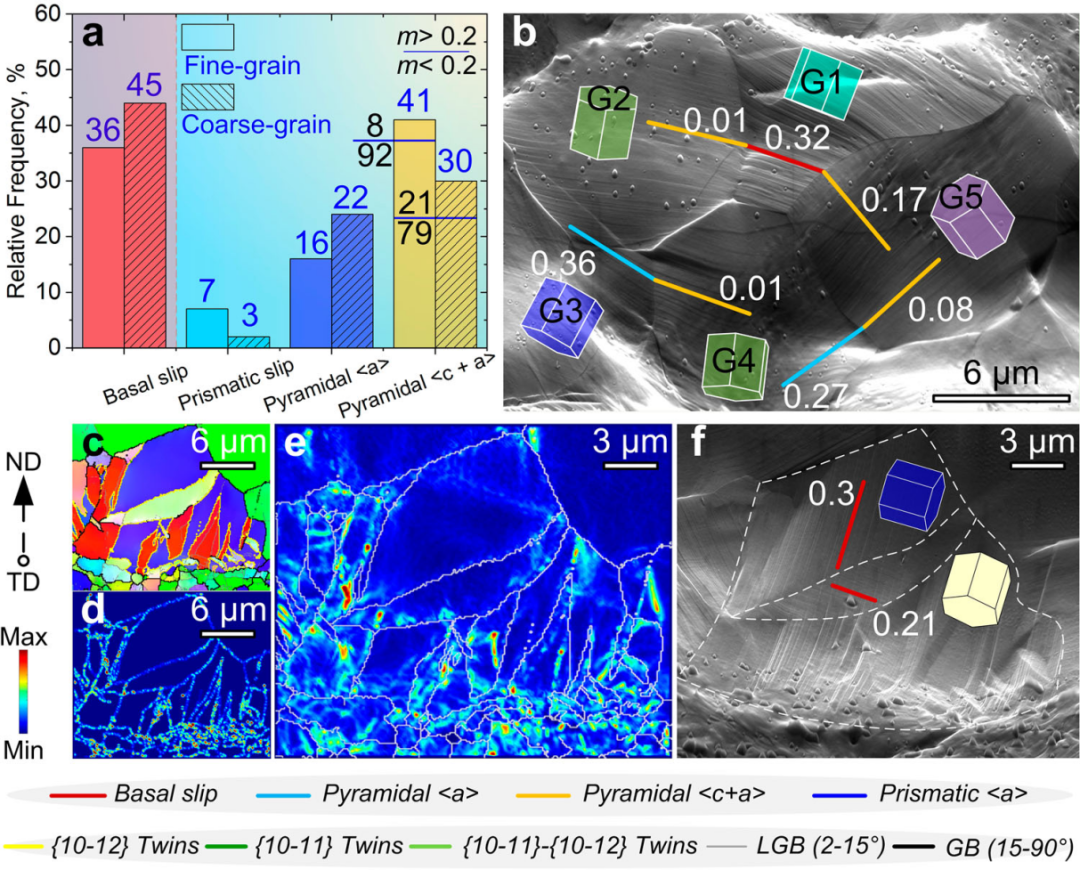 图 5(a)确定的CG层和FG层滑动活动的统计结果;(b)CG层典型区域的滑移转移;(c)-(f)激活羽毛状张力孪晶时,典型CG异质界面附近的IPF、标度梯度密度(rad μm-2)、标度地密度(μm−1)和扫描电镜,白色数字表示单轴载荷下m值(施密特因子)。