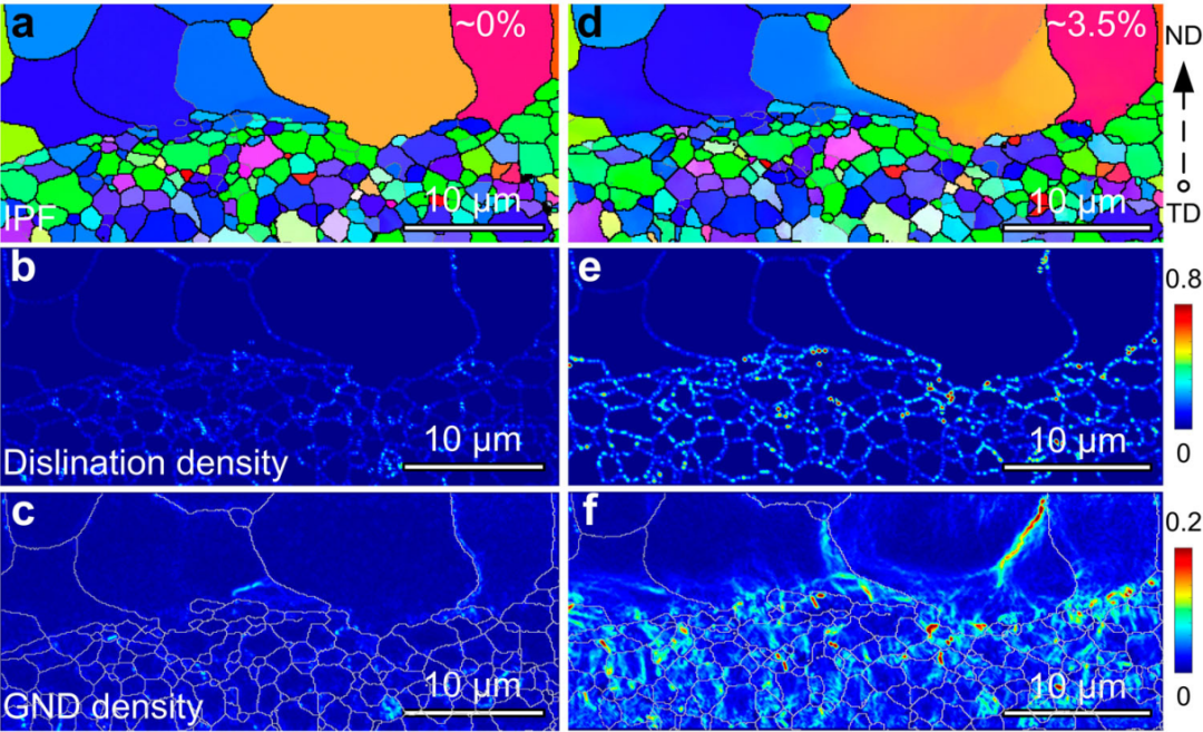 图 3(a)未变形HL-Mg合金的IPF图;(b)标量分辨密度(rad μm−2)和(c)标量GND密度(μm−1);(d)3.5%应变HL-Mg合金的IPF图;(e)标量分离密度(rad μm−2)和(f)标量GND密度(μm−1)。