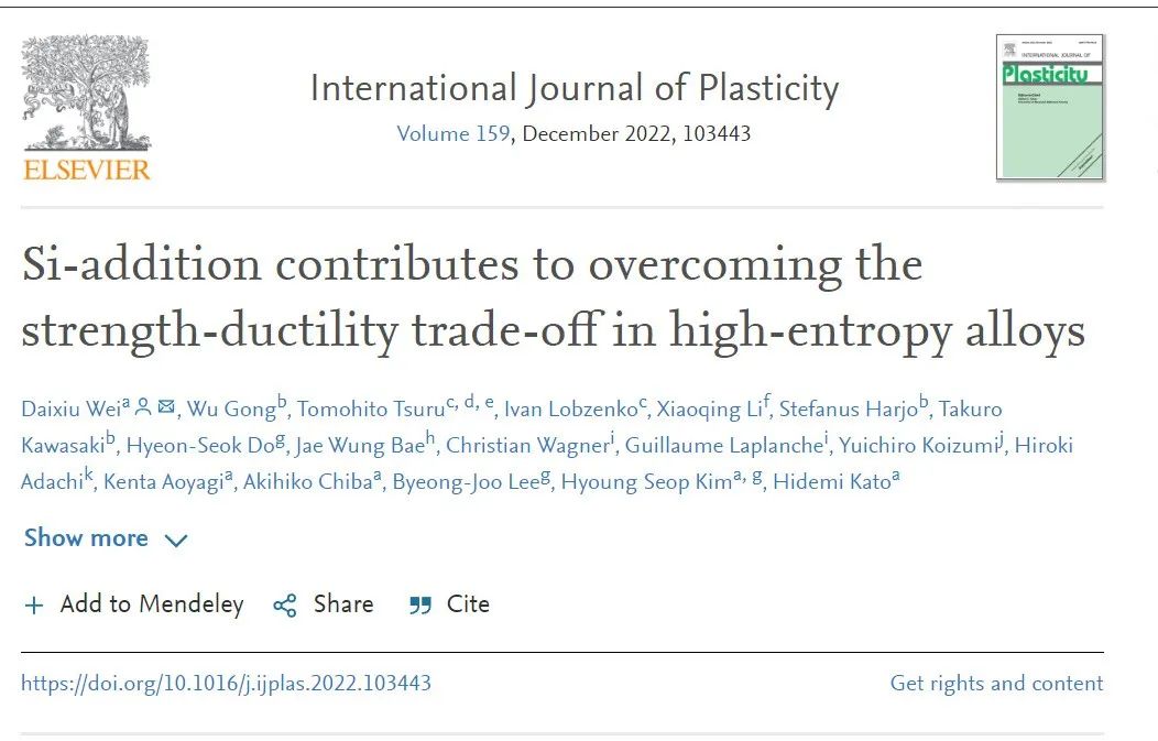 日本东北大学材料研究所Daixiu Wei等人联合日本原子能机构J-PARC研究中心、京都大学、瑞典皇家理工学院、浦项科技大学、大阪大学、 日本兵库大学工程研究生院等利用电子微观表征和中子衍射测量,辅助热力学和第一性原理计算,研究了类金属添加对CoCrFeNi HEA力学行为的影响。报道了Si对CoCrFeNi高熵合金组织、SFE、多维力学响应和塑性的影响。发现单相FCC结构保留至(CoCrFeNi)90四10(at.%),并且Si降低了SFE,增加了晶格变形,并调整了塑性机制(影响塑性变形行为),这与延展性和强度的测量增加有关。因此,Si准金属添加克服了金属合金常见的传统强度/延展性权衡,为高性能合金的发展开辟了一条新道路。相关研究成果以题为Si-addition contributes to overcoming the strength-ductility trade-off in high-entropy alloys发表在International Journal of Plasticity上。