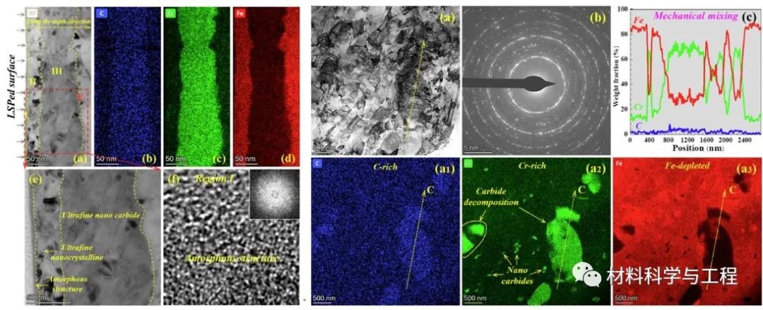 图2 LSP诱导的基体纳米化、富Cr碳化物分解和纳米碳化物析出