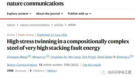 中南大学、南方科技大学、德国马普所等单位的研究人员合作的此项成果以题目为“High stress twinning in a compositionally complex steel of very high stacking fault energy”发表在《Nature Communications》上。