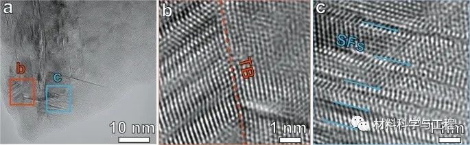 图4 a裂纹区域附近的孪晶和堆垛层错。b孪生。c堆垛层错。