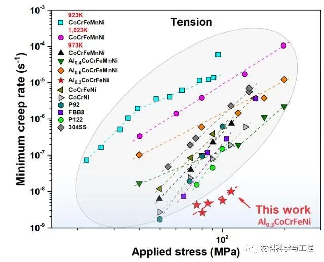 如下图所示,在973K下,本研究对Al0.3CoCrFeNi与其他已报道的部分高熵合金和传统合金的最小蠕变率进行了比较。研究表明Al0.3CoCrFeNi合金表现出极其优越的耐高温蠕变性,最小蠕变率比已报道合金低1-4个数量级。这种优异的高温性能归功于显著的固溶强化,低的层错能与蠕变过程中不断产生的L12与B2相引起的析出强化作用的最佳结合效果。