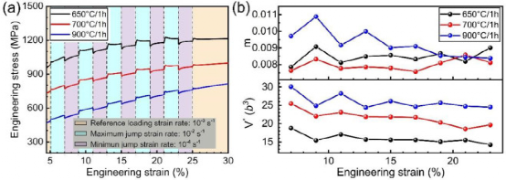 图7.(a)通过10-2 s-1和10-4 s-1的应变率跳跃测试获得的工程应力-应变曲线。(b)应变率敏感性和与工程应变的表观活化体积。