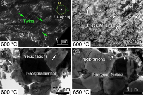 图3.典型的TEM图像显示Fe48.5Mn30Co10Cr10C0.5N1.0 iHEA的微观结构在不同温度下退火1小时:(a-c)600°C;(d)650°C。