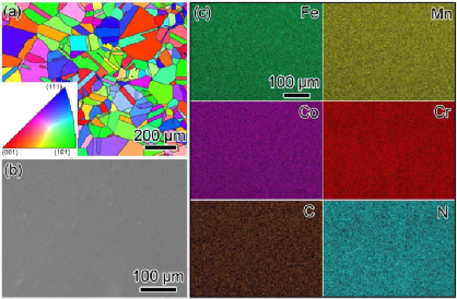 图1.(a)均质化Fe48.5Mn30Co10Cr10C0.5N1.0 iHEA的EBSD地图。(插图是反向极图颜色代码)。(b)SEM图像。(c)来自(b)扫描区域的EDS映射,显示均质化Fe48.5Mn30Co10Cr10C0.5N1.0 iHEA中元素的均匀分布。
