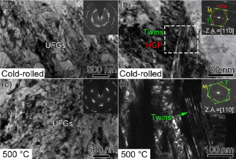 图2.典型的TEM图像显示了Fe48.5Mn30Co10Cr10C0.5N1.0 iHEA在冷轧(a,b)和在500°C下退火1小时(c,d)后的微观结构。(d)是观察纳米双层的暗场图像。相应的选定区域电子衍射(SAED)模式在右上角以插入的形式给出。