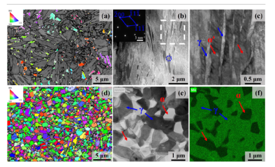 RT Q&P(a-c)和IA钢(d-f)的初始微观结构。(a)奥氏体和BC图的IPF,(b)HAADF图像,SAED在蓝色圆圈中,区域轴是奥氏体的[011],(c)RT Q&P钢,奥氏体和马氏体的白色矩形内的放大TEM图像分别用蓝色和红色箭头表示;(d) 奥氏体的IPF和BC图,(e)HAADF图像,(f)IA钢,奥氏体和铁素体的(e)中显示的Mn重量百分比分布分别用蓝色和红色箭头表示。
