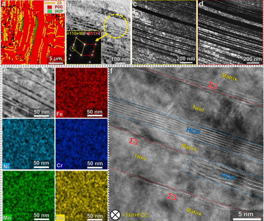图3,在拉伸变形之前在700 ◦C下退火的1型样品中纳米孪晶区域的微观结构分析。(a)突出显示Σ3的EBSD相位图,纳米孪晶区域的孪生边界。(b)中的插图是<110>区域轴上的SAED图案,具有孪生和矩阵反射。(e) HAADF-STEM-EDS分析显示铁、锰、钴、铬和镍分布均匀。
