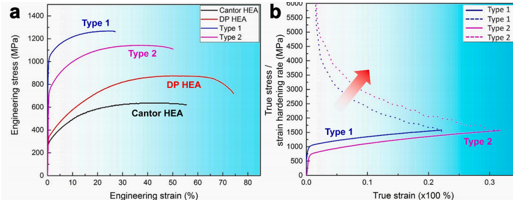 图6.(a)在700°C(1型)和800°C(2型)下退火的非等原子高熵合金样品的工程应力-应变曲线;等原子高熵合金的曲线(b)与相应应变叠加的真实应力-应变曲线硬化曲线。红色箭头表示应变硬化的增加。