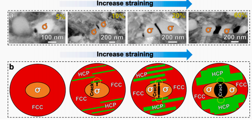 图10. .退火样品细晶区域中的变形微观结构800 ◦C(类型 2)。(a)具有局部应变的细粒度区域的 ECC 图像 ~60%类型 2 样品;插图是对应的EBSD阶段图;裂缝由浅蓝色圆圈。FCC 和 HCP 阶段是以红色和绿色突出显示。(b)裂解区域的明场透射电镜图像西格玛阶段。插图是 SAED 图案裂缝附近的西格玛相。(c)和(d)高分辨率HAADF-STEM图像裂缝附近的西格玛和HCP相位。"σ"指西格玛阶段。