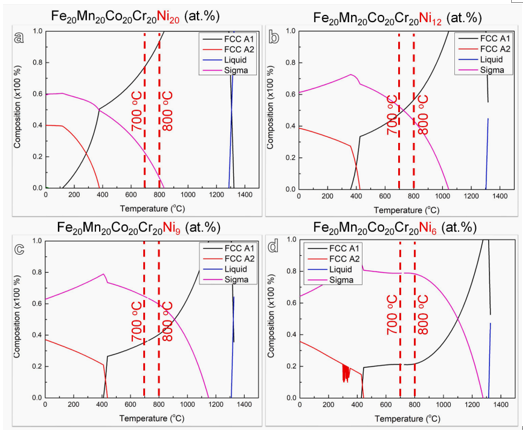 图11. 热计算器预测了Fe40-xMn20Cr20Co20Nix的TCHEA 3.0相图:(a)x=20,(b)x=12,(c)x=9和(d)x=6。所有图像中的两条虚线表示退火温度(700 和 900 ◦C)。