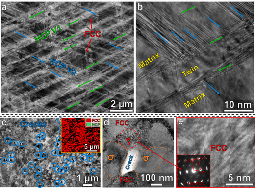 图8(a)两种类型的HCP变体(V1和V2)拉伸变形后在700 ◦C(类型1)下退火的样品中纳米孪晶区域的ECC图像。(b)两种HCP变体的高分辨率TEM图像。(c)类型中靠近断裂表面的超细晶粒区域的ECC图像(局部应变~40%);插图是EBSD相位图,裂缝由浅蓝色圆圈突出显示。(d)西格玛相位内裂纹区域的明场透射电镜图像粒子。(e)裂缝附近矩阵的高分辨率透射电镜图像;插图是裂缝附近基体的SAED图案。“σ”是指西格玛阶段。