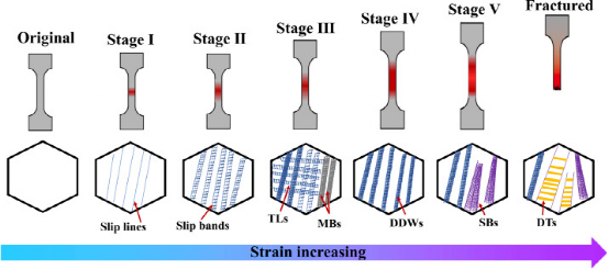图17所示:多级应变硬化机理示意图。“TLs”表示泰勒晶格。“MB”代表微带。DDW代表密集的位错壁。“SBs”表示剪切带。“DTs”代表变形双胞胎。