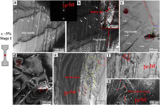 图10所示:M1.5A-LRCCA在Ⅰ阶段应变为~ 3%时位错构型的TEM图像。(a)显示滑移带阵列的BF图像。插入显示SAED图案的图像。(b)与(a)对应的TEM-DF图像。插入图像为两束暗场(DF)图像,表示滑移带中的位错。(c, d)显示位错与富zr粒子相互作用的TEM BF和DF图像。(e, f, g)不同位错构型。