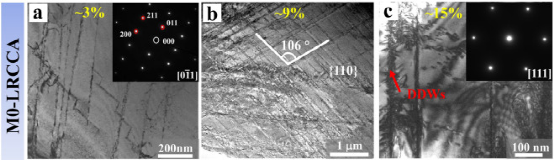 图8所示:透射电镜观察M0-LRCCA变形组织。(a)应变为~ 3%(阶段I)时变形诱导的位错子结构。插入图像显示相应的SAED模式。(b)应变为~ 9%时的变形诱导位错亚结构(阶段II)。(c)应变为~ 15%时的变形诱导位错亚结构(阶段III)。插入图像显示相应的SAED模式。