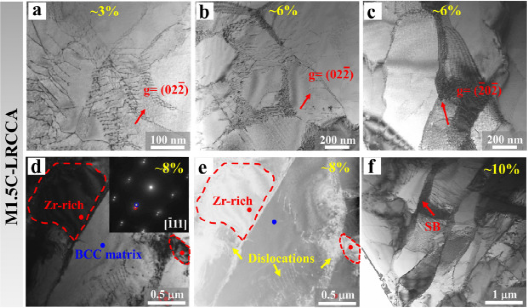图9所示:透射电镜观察M1.5C-LRCCA变形组织。(a)应变为~ 3%时的变形诱导子结构(I阶段)(b, c)应变为6%时的结构(II阶段)(d, e)应变为~ 8%时的结构(III阶段)。插入图像显示相应的SAED模式。(f)应变为~ 10%的结构(第四阶段)。