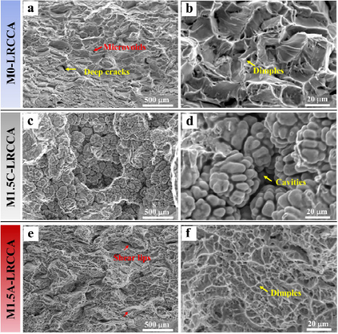 图7所示:三个样品的断口形貌。左柱展示了大规模的断口形貌。右柱显示小规模的断口。(a, b) M0-LRCCA。(c, d) M1.5C-LRCCA。(e, f) M1.5A-LRCCA。