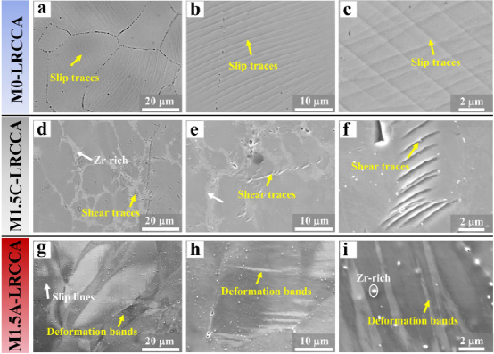 图6所示:三种试样变形后的表面形貌。M0-LRCCA (a - c)。(d-f) M1.5C-LRCCA。(g-h) M1.5A-LRCCA。