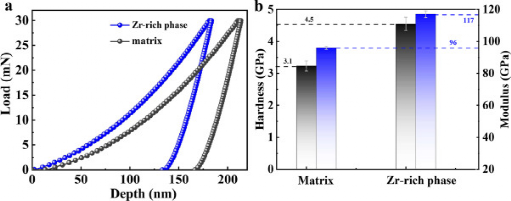 图5所示:基体和富锆相的纳米压痕分析。(a)基体和富Zr相的载荷-深度曲线。(b)基体和富Zr相的硬度和模量。