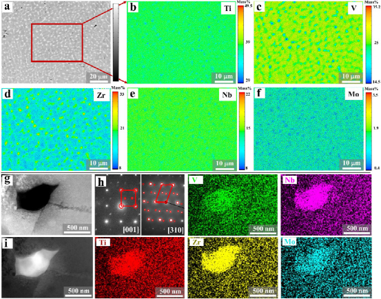 图3所示:M1.5C-LRCCA的元素分布分析。(a)BSE图像。(b-f) Ti, V, Zr, Nb, Mo的EPMA映射。(g, i)亮场(BF)和暗场(DF)图像。(h) (g)沿zone =[001]和[310]方向的SAED模式。Ti、V、Zr、Nb、Mo为(g)对应的EDS映射图像。