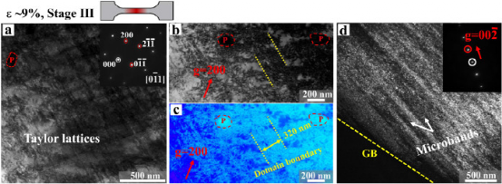 图12所示:M1.5A-LRCCA在Ⅲ阶段应变为~ 9%的变形诱导位错亚结构的TEM图像。(a)显示泰勒格的BF图像。插入图像是对应的SAED图案。(b, c)显示高密度位错亚结构的BF和DF图像。域边界指向泰勒晶格域边界。“P”代表沉淀物。(d)显示微波段的DF图像。“GB”为晶界。