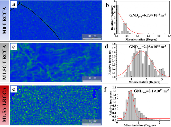 图16所示:三种样品的初始位错分布和平均位错密度。左列显示EBSD KAM地图。右列显示了相应的错向角和计算的平均位错密度。(a, b) M0-LRCCA。(c, d) M1.5C-LRCCA。(e, f) M1.5A-LRCCA。