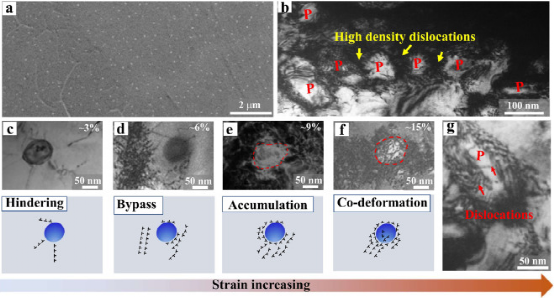 图15所示:M1.5A-LRCCA中富Zr相与位错的相互作用。(a)富Zr相的随机分布。(b)高密度位错和富Zr相。(c-f)富Zr相与位错的相互作用过程。(g)富锆相的位错。