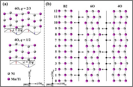铁弹性合金中的马氏体转变是在转变温度以下由高对称性奥氏体(a)向低对称性马氏体(M)的无扩散结构转变,具有快速动力学。在Heusler合金中,经常观察到周期性调制马氏体,其中M和O分别表示单斜晶体结构和正交晶体结构,数字表示调制周期内原子层数量。与调制马氏体相变相关的诱人性能,如巨大磁弹性,磁热,弹性热和磁电阻效应,已被报道,为先进的工业应用提供了巨大的潜力。然而,体心立方(bcc)单位细胞如何扭曲成调制结构还不完全清楚,尽管它的流行和吸引人的特性。