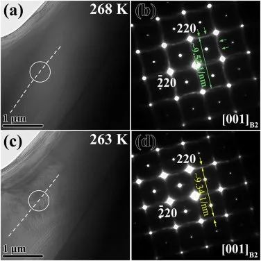 图5所示:原位冷却至268 K (a, b)和263 K (c, d)时Ni50Mn32Ti18合金另一个区域的亮场图像和SAED模式。