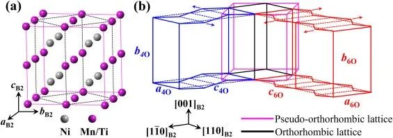 图4所示:(a) B2型Ni-Mn-Ti奥氏体的单位胞。(b)伪正交晶格(由晶格剪切得到的bcc)与6O/4O马氏体之间的晶体学关系。