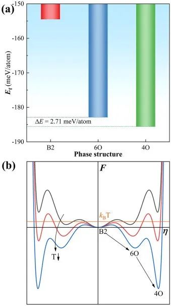 图11所示:(a) Ni24Mn15Ti9(Ni50Mn31.25Ti18.75, at.%)合金中B2、6O和4O相的形成能。(b)两步马氏体相变的自由能图。