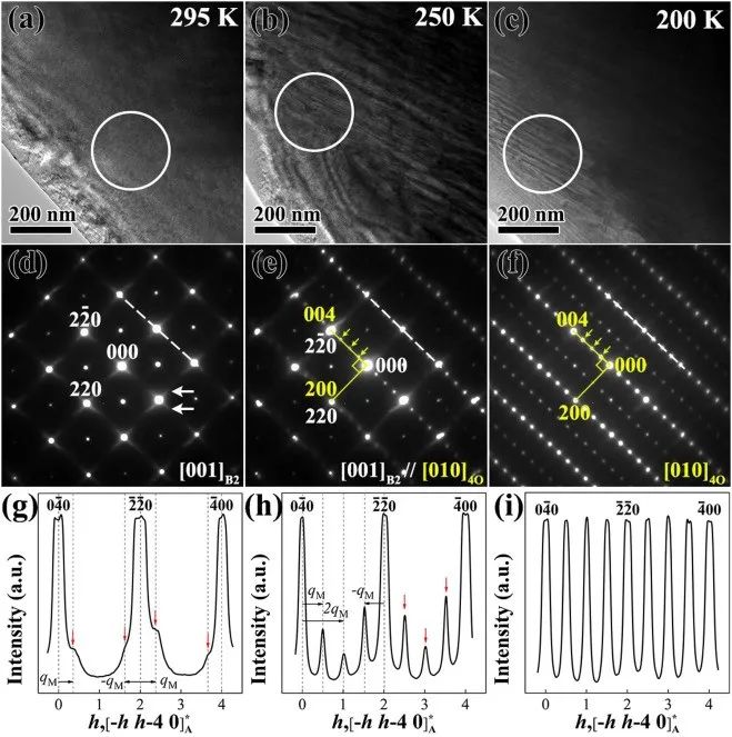 图3所示:Ni50Mn32Ti18合金原位冷却至295 K、250 K和200 K时的亮场图(a-c)、SAED图(d-f)和强度分布图(g-i)。(图2a同区域)。