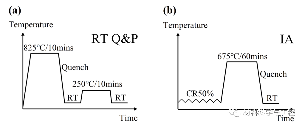 图 1.(a)RT Q&P钢和(b)IA钢的加工路线