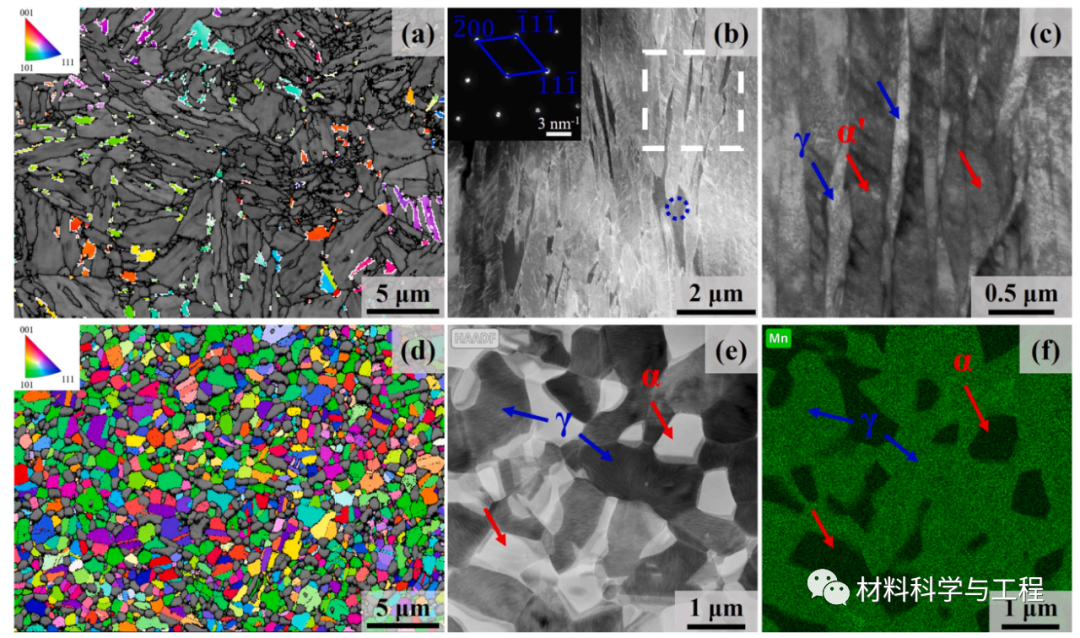 图 2.RT Q&P(a-c)和IA钢(d-f)的初始微观结构。(a)奥氏体和BC图的IPF。(b)HAADF图像,SAED在蓝色圆圈中,区域轴是奥氏体的[011]。(c)RT Q&P钢,奥氏体和马氏体的白色矩形内的放大TEM图像分别用蓝色和红色箭头表示。(d) 奥氏体的IPF和BC图。(e)HAADF图像。