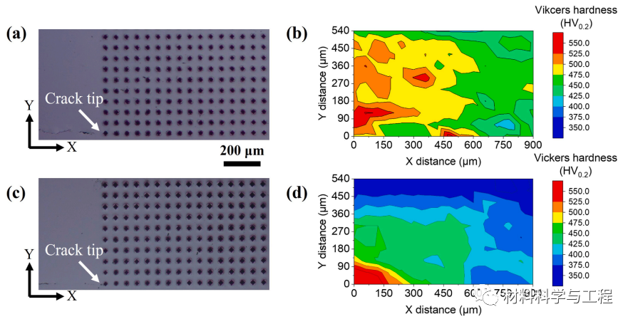 图 6.IA和RT Q&P钢的裂纹增长行为.(a)IPF,(b)RT Q&P C(T)样品的相图.(c)IPF和(d)IA C(T)样品的相图。