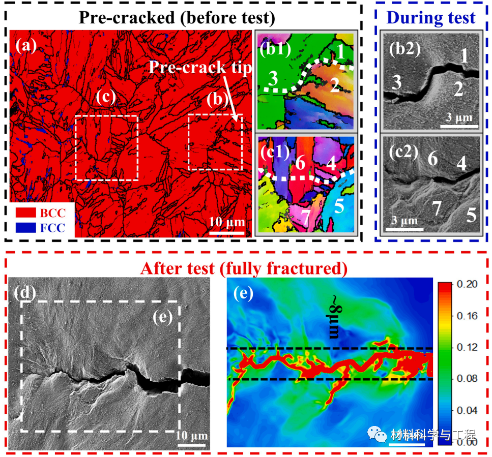 图 5.RT Q&P钢的断续裂纹萌生测试.(a)初始相图,(b1)IPF和(b2)第一个选定区域的SEM.(c1)IPF和(c2)第二个选定区域的SEM.(d)显示裂纹路径的断裂样品的SEM.(e)DIC计算的Von-Mises应变.