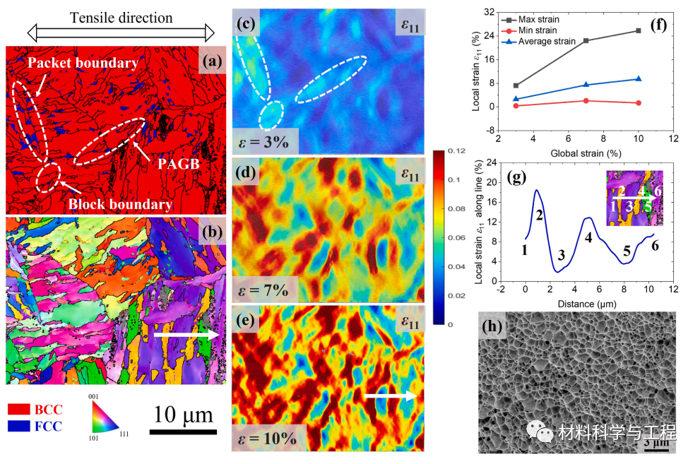 图 4 RT Q&P钢的 Micro-DIC 结果:(a) 相图,马氏体为红色,奥氏体为蓝色;(b) 测试前平面法线的 IPF 图;(c)至 (e) 局部全局应变为 3%、7% 和 10% 时的单轴应变分布;(f)局部应变随全局应变的演化;(g) 沿 (e)、(h) 断裂面中白色实线的应变局部化。