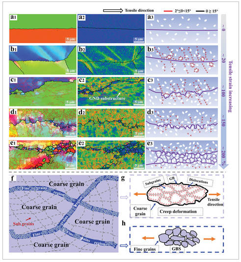 图4 (a-e)当拉伸应变为0、20%、100、150%和220%时,粗粒HC-LRMEA试样观察到的变形过程EBSD表征和示意图:1个IPF图;2张KAM地图;3个说明其作用变形机制的示意图。f)粗晶粒区亚晶粒和细DRX晶粒带示意图;G)粗晶粒变形机理示意图;h)显示精细DRX晶粒带中晶界滑动的示意图。