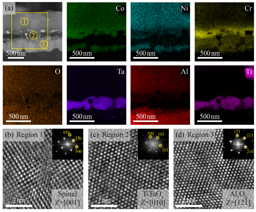 图4. (a)合金在1000°C下氧化100h后的横截面STEM图像和相应的元素分布,(b)-(d)STEM中相应区域的HR-TEM图像。