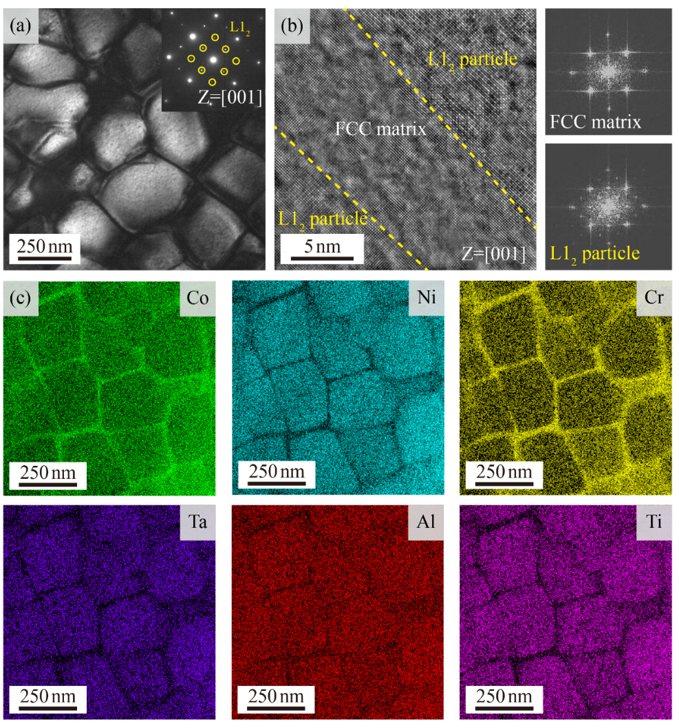 在现代能源工业和航空航天工程中,迫切需要具有突出高温性能的先进结构材料来提高能源效率和可靠性。高熵合金的多主元设计策略为更优性能组合提供了前所未有的可能性。其中,多组分L12沉淀强化的块状高熵合金在结构材料领域引起了广泛的兴趣。例如,将具有优异热稳定性的多组分L12沉淀颗粒与延展性面心立方基体结合在一起,可以实现优于传统镍基和钴基高温合金的综合机械性能。然而,与大多数结构材料一样,多晶结构的高熵合金也面临着严重的中温脆化以及高温下快速软化和氧化问题,这极大地限制了其在现代工业中的应用。值得注意的是,单晶的合成的方法提供了一条有效的途径来消除晶界的不利影响,这有望大大提高合金的耐温能力。然而,目前高熵合金研究主要局限于多晶结构,对单晶高熵合金及其性能的研究还有所欠缺。