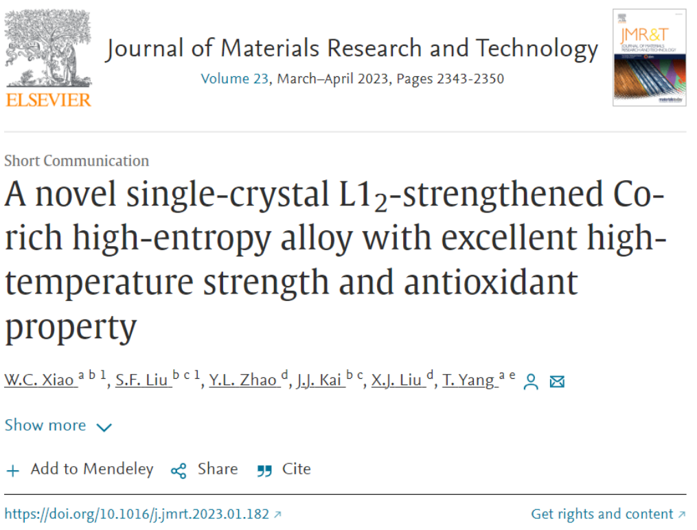 基于此难题,香港城市大学杨涛等研究者设计了一种基于 Co-Ni-Al-Ta-Cr-Ti体系的新型单晶沉淀强化高熵合金,在1250度的高温处理后仍然维持了高体积分数的多组分L12析出颗粒,并显示出了非常优异的机械性能和抗氧化性能。相关成果以“A novel single-crystal L12-strengthened Co-rich high-entropy alloy with excellent high-temperature strength and antioxidant property”为题,于2023年02月01日发表在国际知名期刊《Journal of Materials Research and Technology》上。论文通讯作者为香港城市大学杨涛教授,第一作者为博士生肖维城和博士后刘少飞。合作者包括香港城市大学开执中教授,哈尔滨工业大学赵怡潞教授,刘兴军教授等。