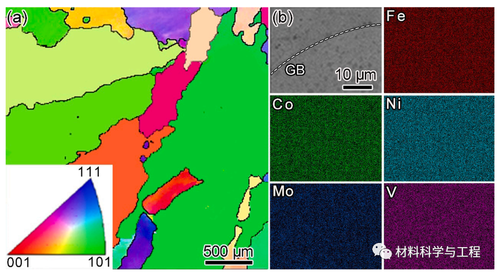 图 1.蠕变试验前退火Ni2Co1Fe1V0.5Mo0.2MEA样品的微观结构和组成分布。(a) 显示毫米级晶粒的EBSD晶体取向图(插图为反极图颜色代码)。(b) SEM-EDS图,显示MEA中镍、钴、铁、五和钼元素的均匀分布。