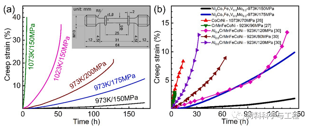 图 2.(a) 在施加应力 150–200 MPa 和温度 973–1073 K 下测试的 Ni2Co1Fe1V0.5Mo0.2MEA 的蠕变应变 (ε) 与时间 (t) 图。(b) 一些多边环境协定和高熵合金的拉伸蠕变性能比较