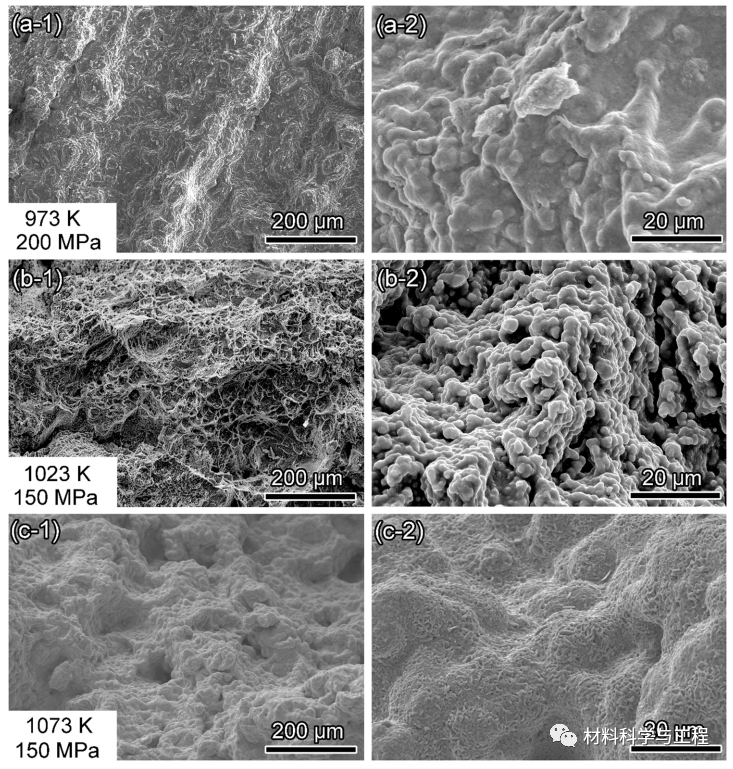 图 6. 扫描电子显微镜图像显示了断裂样品的断口形貌:(a-1)和(a-2)解理面在973K/200 MPa样品上;(b-1)和(b-2)韧窝和球状颗粒在1023K/150 MPa样品上;(c-1)和(c-2)球状颗粒在1073K/150 Mpa样品上.