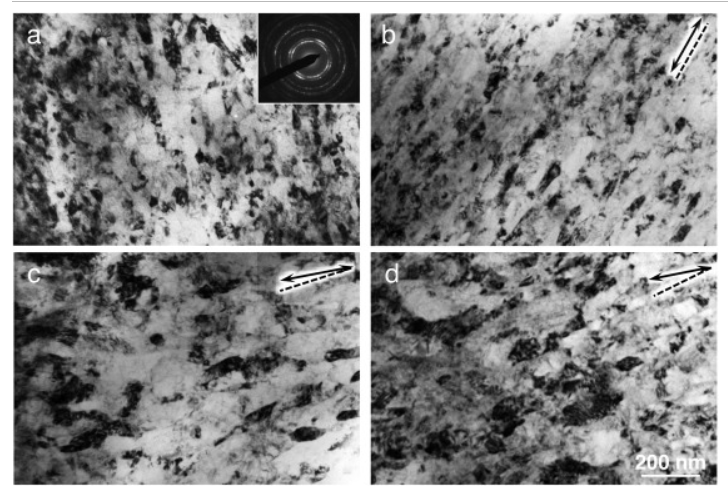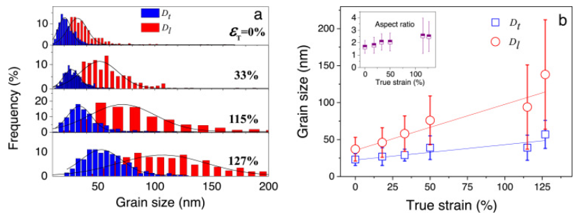 图7 (a) 显示顶部10 μm纳米晶层晶粒尺寸分布演变的直方图(横向和纵向,Dt和Dl)。标记相应的真实菌株;(b)用真实应变绘制纳米晶层(深度0 10μm)的平均晶粒尺寸。插入是相应的纵横比随真实应变而变化。