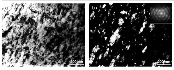 图2 (a) 梯度纳米晶粒 316 L SS 最顶层 (10 μm) 横截面微观结构的典型明场和 (b) 暗场图像。