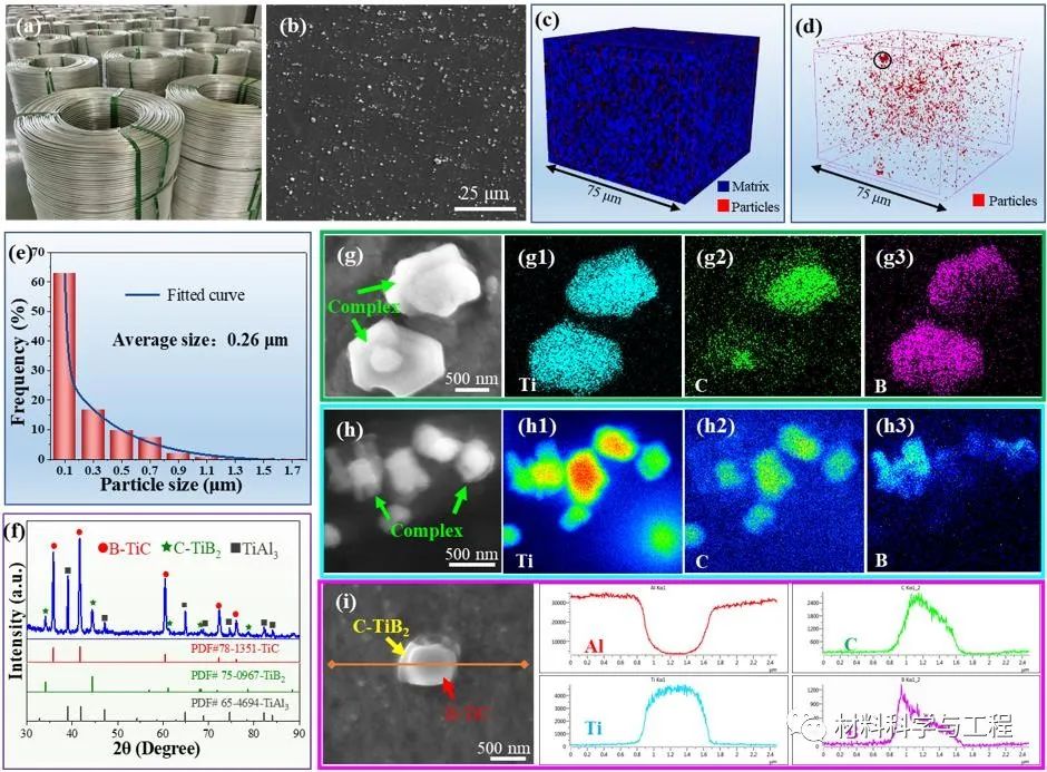 图1 Al-TCB晶种合金的表征。Al-TCB晶种合金内的TCB复合体细小均匀弥散,其中TCB复合体由B掺杂型的TiC和C掺杂型的TiB2构成。